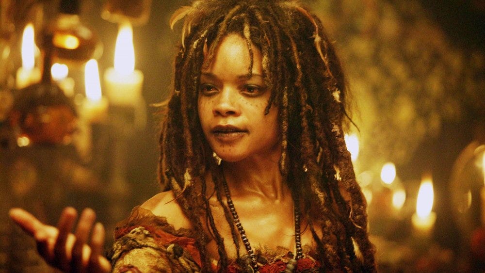 In 2006 when the film was made, the locs may have been a reference to spiritual beliefs of Rastafarianism. Rastafari take the Nazarite Vow to not cut their god-given hair, and therefore preserve their hair in the protective style of locs. Hair in this belief system contains the power of one’s own life force, and the protection and omnipotence of god. A reference to god’s power might underscore the power of the sea witch herself.