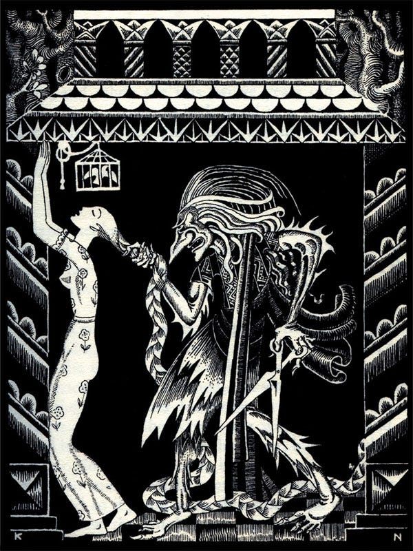 The disintegration of the self in real life is usually symbolic, metaphoric perhaps of a splintering of the physical surroundings that an individual identifies themselves with. “My world is falling apart,” or “I split into a thousand pieces.” In fairy tales, however, it is possible to make the symbolic literal. The story of Rapunzel (in any retelling) might in fact showcase a splintering of the witch’s own identity such that Rapunzel and her hair become symbolic of the witch’s power itself, through the trauma of being systemically and historically hunted by figures like Kramer and Sprenger, witch-hunters.