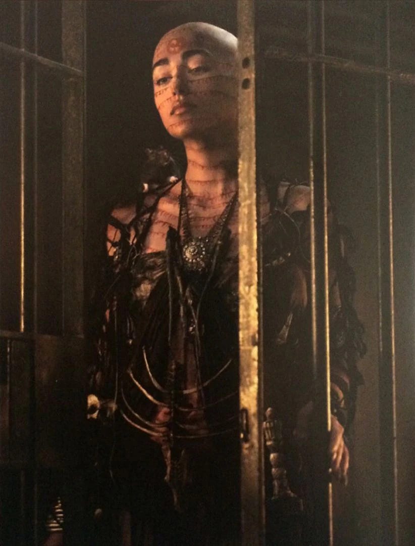 In 2017 another mystical femme figure also bearing a non-western identity entered the franchise. Shansa, a sea witch with a shaved head played by Iranian-French actor Golshifteh Farahani, shows up In Dead Men Tell No Tales (2017). Although we are used to white witches being portrayed with unruly, messy, often curly hair, it is interesting that two non-western witches in the Pirates franchise are furnished with powerful hair stories of their own, whether styled with locs, or a shaved head.