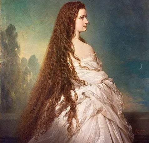 It instantly reminded me of one of my favorite hair icons, Empress Elisabeth of Austria, or Empress “Sisi,” who was born 1834 in Munich, Germany and assassinated in 1898 with a needle to the heart on a trip to Geneva, Switzerland. Empress Sisi became the empress of Austria—and later Austria-Hungary—when she married Emperor Franz Joseph I of Austria in 1854, a member of the house of Habsburg.
